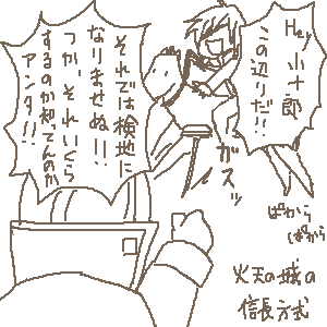 火天の城で信長が馬を走らせて、馬上から槍投げのように棒を何本も地面に突き刺して、「ここに城を造る」と、安土城建設場所決定のシーンがありました。そのパロ。